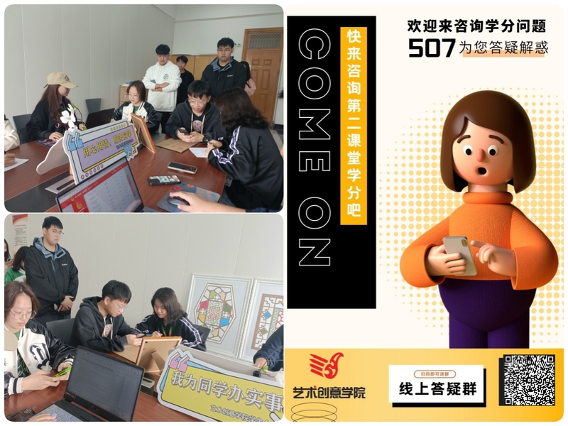 答疑值班室,解惑第二課堂。為了更好地服務學生,規范有序開展基礎團務工作,解答學生的各類疑問,藝術創意學院團委每周三下午在敬業樓507安排學生干部值班,專門負責解答學生各類團務問題,服務內容涵蓋智慧團建關系轉接、第二課堂PU賬號登錄,第二課堂學分申請等問題,同學們可以在這個時間段內直接到現場咨詢和辦理相關事宜,實現一站式服務。此外,答疑還開通了線上咨詢渠道,方便學生通過線上線下多種途徑解決問題,保障學生問題能夠得到有效快速的解決。