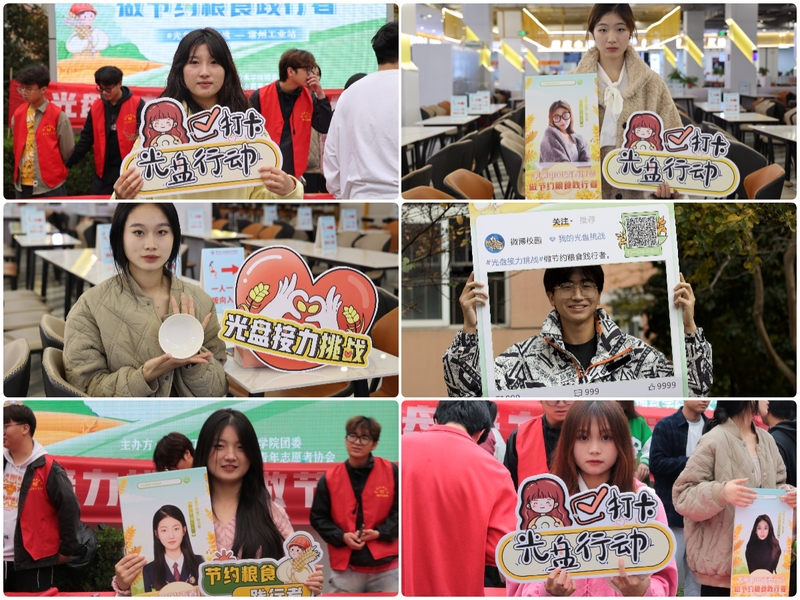 活動由線上和線下兩部分組成,分為主題團日活動、專題公開課觀摩、線上光盤打卡、線下落地宣傳幾大板塊,均受到了同學們的廣泛參與,累計有8000多名學生參與到了本次活動,取得了良好的活動效果。同學們通過前期微博超話打卡、光盤接力挑戰等線上方式,積極參與光盤行動。在線下活動現場,大學生志愿者們熱情耐心的講解本次活動的意義,呼吁大家在日常生活中要樹立勤儉節約的好習慣和文明健康的生活理念。線下活動現場還安排了光盤行動助力官,為本次活動宣傳助力。宣傳大屏幕和“做節約糧食踐行者”的人形立牌吸引來了眾多同學們前來打卡拍照,大家通過現場微博掃碼發布超話,領取精美小禮品。同學們還圍繞光盤行動主題結合專業特色和非遺傳統技藝,設計創作了刻紙作品,更好的宣傳本次活動。小餐桌,大文明。在常工業校園里,通過本次線上線下持續一個月左右時間的宣傳活動,讓節約糧食成為校園健康生活的新時尚。