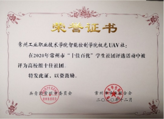 我們的學長們積極參加各類技能技術比賽,獲得江蘇省大學生電子設計競賽無人機專賽項一等獎、江蘇省“挑戰杯”大學生課外學術科技作品制作二等獎;“互聯網+”創新創業大賽江蘇省二等獎;常州市高等教育和職業教育創新創業大賽高校組二等獎;江蘇省大學生機器人大賽“室內空中巡邏救援”無人機賽項一等獎;“野外空中巡邏救援”無人機賽項三等獎;全國職業院校農業植保機技能大賽三等獎;“極光UAV”無人機社團在2019年、2020年連續兩年被評為常州市十佳社團;學生獲得無人機方向1項發明專利和多項實用新型專利的授權。
