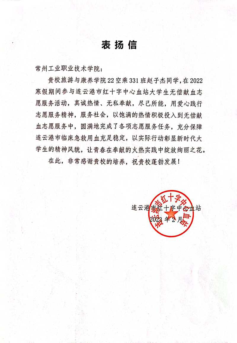 由丁偉軒、張政、郝家欣、趙子杰等同學(xué)組建的“大學(xué)生無(wú)償獻(xiàn)血志愿活動(dòng)服務(wù)實(shí)踐團(tuán)”在連云港參與志愿獻(xiàn)血服務(wù),受到當(dāng)?shù)卣膩?lái)信表?yè)P(yáng)產(chǎn),他們的事跡在連云港市中心血站微信公眾號(hào)上宣傳,進(jìn)一步激發(fā)青年學(xué)子的志愿服務(wù)精神。趙子杰表示:“在參加無(wú)償獻(xiàn)血志愿服務(wù)工作的同時(shí),我進(jìn)行了人生中的第一次獻(xiàn)血。說(shuō)實(shí)話,第一次獻(xiàn)血還是有點(diǎn)緊張的,心里還是有一點(diǎn)點(diǎn)害怕的,但一想到我的血液可能挽救一名生死攸關(guān)的人,內(nèi)心非常激動(dòng),也感覺(jué)非常的有意義。我的志愿者累計(jì)時(shí)長(zhǎng)達(dá)22個(gè)小時(shí),以后我將繼續(xù)努力幫助更多需要的人。”