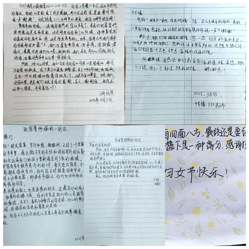 3月8日下午,馨緣種子社的志愿者們帶著幾十封“情書”、幾份手工分別來到我校10棟學生公寓樓,這些禮物均是我校馨緣種子社的大學生志愿者們親手創作。志愿者們將這些特殊的禮物送給了校園里的媽媽——宿管阿姨們,并向她們致以節日的問候和美好的祝愿。一句句祝福的話語,一個個暖心的舉動,一件件精致的手工,同學們用自己的方式訴說著對“媽媽們”的感激之情。