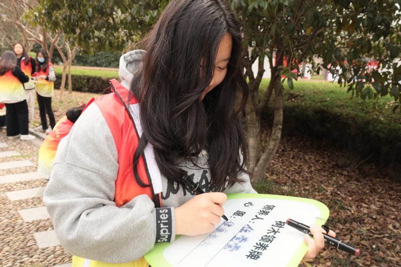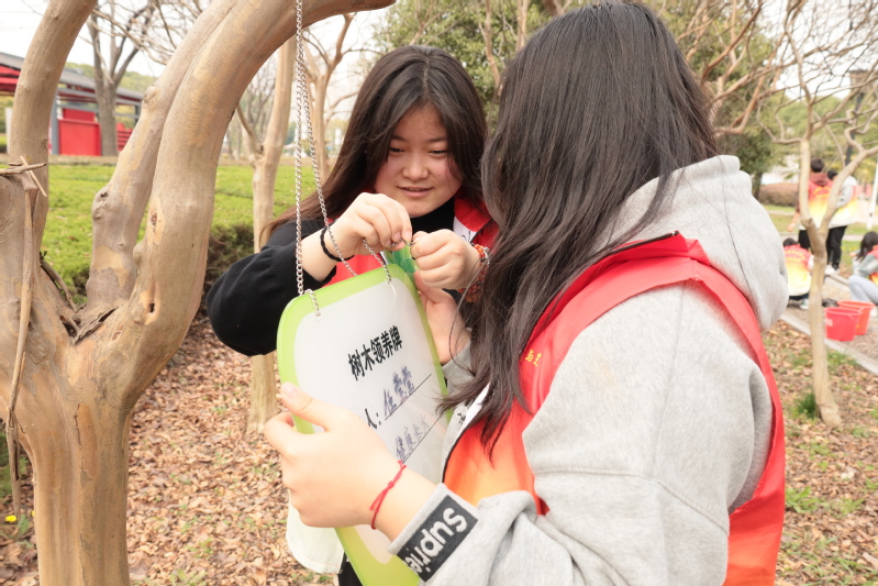 活動中,學生志愿者手拿工具,在校園里的小樹林,清理小樹林里面的垃圾。他們清理小樹林里面的垃圾,讓樹林更加干凈,讓校園環境更加清透美好。隨后,他們有序地抬水、倒水,澆灌下希望。最后,他們認領了樹木,為這些希望之樹掛上了心愿樹牌,期望它們能茁壯成長、生生不息,釋放出“我們一起長大”的美好愿望。