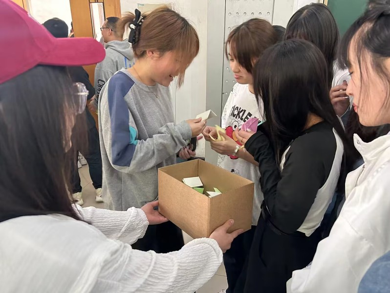 隨著各位同學的進場,社團干部一一下發(fā)了五顏六色的折紙,不同顏色代表了不同的情緒。同學們選取符合自己情緒的顏色,并在折紙上寫下自己內(nèi)心的獨白,有人分享自己的喜悅,有人傾訴自己的煩惱,有人搞怪留下自己吃虧的經(jīng)歷,勸誡陌生人不要上當……分享快樂,你會得到雙倍的快樂;傾訴煩惱,內(nèi)心自然也會得到疏解,減少一份憂愁。接下來同學們將自己所寫的紙條,任意折成自己先下最想要的模樣,有人把快樂折成飛機,有人把煩惱揉成紙團,也有人把夢想折成千紙鶴。等大家手中的“作品”完成,社團干部把這些折紙一一收進盲盒,隨后讓大家有序上來進行折紙盲抽,自己的心緒漂流,你也將收到另一個人的情緒分享,或喜或憂,但這些都不妨礙每個人堅定知道自己想要成為什么樣的人。沒有永遠的艷陽天,也沒有永遠的梅雨季。希望大家通過情緒分享知道其實每個人都有屬于自己的夢想,快樂,憂愁,在成長的道路上,大家多多少少都會遇到坎坷難題,一帆風順的道路固然令人羨慕,但跌跌撞撞的成長更令人敬仰。希望同學們都會找到自己的燈塔,并且堅持不懈地朝它行進。