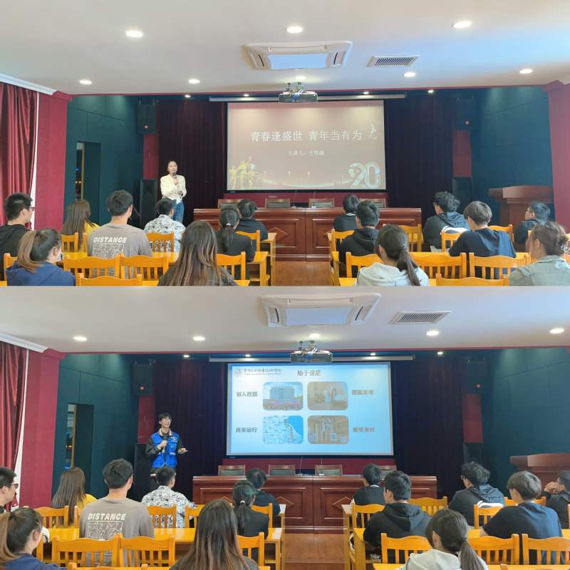 王瑋涵以深思細悟黨的二十大報告為開篇,用“大道理”轉化為“小行動”的生動講述方式,引導同學們把學習黨的二十大精神成果轉化為實際行動。她強調,同學們不僅要用黨的二十大精神武裝自己的頭腦,堅定理想信念,提高思想認識與政治站位,在青春賽道上奮力奔跑,以昂揚的姿態、進取的精神,書寫無愧于時代的青春篇章,更要自覺將黨的新理念、新思想、新戰略落實到學習與生活之中,腳踏實地,緊跟黨走,精研專業知識,以真才實干為全面建設社會主義現代化國家、全面推進中華民族偉大復興貢獻青春力量、匯聚磅礴偉力。