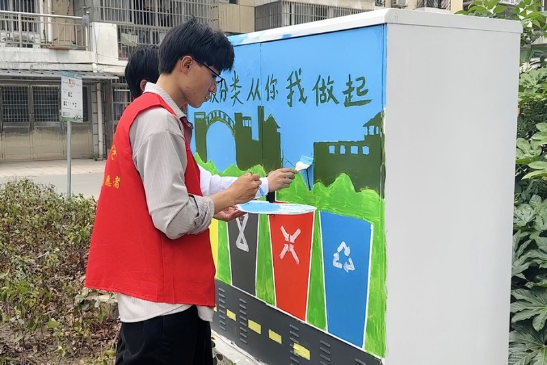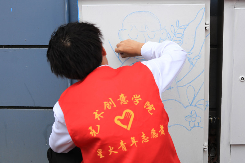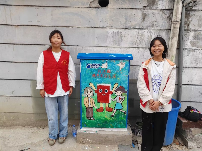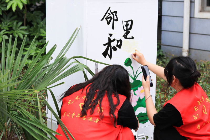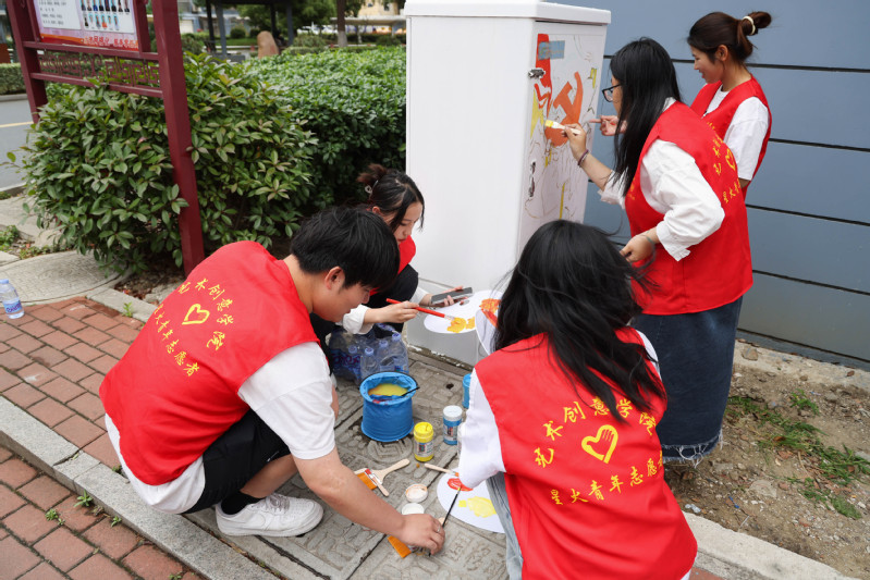 共建儀式上,藝術創意學院分團委書記丁潔還向大家介紹了本次“青春五彩·藝起幸福”社區專項服務的基本內容。儀式結束后,藝術創意學院的大學生志愿者們還在社區開展了“校社聯動創和諧,美化家園我來繪” 社區電表箱主題手繪志愿服務,用專業技能助力社區環境美化。志愿們圍繞思想引領、社區文明倡導、環境保護等方面為大學新村三社區創作了一幅幅精美的手繪作品,讓社區電表箱“靚”起來,促進社區顏值提升。大學生志愿者們在繪畫的過程中,不時引來路過的居民們駐足觀看,得到居民們的一致好評,紛紛為志愿者們點贊。