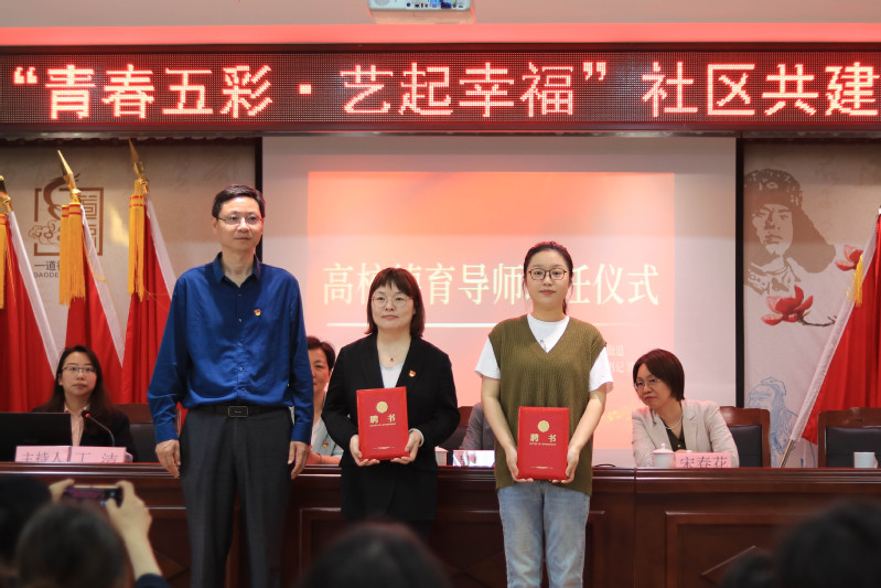 為了激勵引導我院學生崇尚先進、學習先進、爭當先進,有效加強藝術創意學院思政工作隊伍建設,不斷增強思政教育的親和力和影響力,本次活動中,藝術創意學院黨總支副書記、副院長肖新華還代表學院為常州市武進區南夏墅街道團工委副書記朱玉葉、常州市武進區南夏墅街道大學新村三社區黨委書記錢維頒發了高校德育導師聘書。藝術創意學院黨總支委員、副院長孫軍代表學院“一站式”學生社區為大學新村三社區工作人員和社區網格員頒發了“一站式”學生社區綜合管理師徒結對導師聘書。通過師徒結對的形式,社區工作人員將指導學院“一站式”學生社區學生干部做好社區日常服務工作,充分挖掘和借鑒成熟居民社區的先進管理理念和管理方法,將學到的管理方法運用到實際工作中,引領高校學子在社區中提高參與意識、加強實踐鍛煉、增長本領才干。