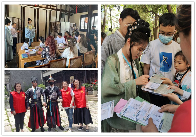 綠樹陰濃夏日長,毗鄰古韻煥新生。藝術創意學院子衿漢服社社員們身著華麗漢服一早來到常州古運河南大街文化旅游區開啟了一天的志愿服務。社員們分散在人民公園、南市河歷史文化街區、民元里、篦箕巷、吾悅廣場五大區域,協助進行簽到蓋章、發放物料、漢服講解、漢服巡游、拍攝打卡、非遺書衣制作體驗、壓花文創體驗、維持活動秩序等,融入常州歷史名人典故、運河水上漢服秀、520主題婚禮儀式、非遺文創市集等特色活動,還原古代大運河繁盛景象,以毗鄰風華游園會的形式,讓大家在游園過程中了解常州古運河沿線各區域的文化典故和風土人情。