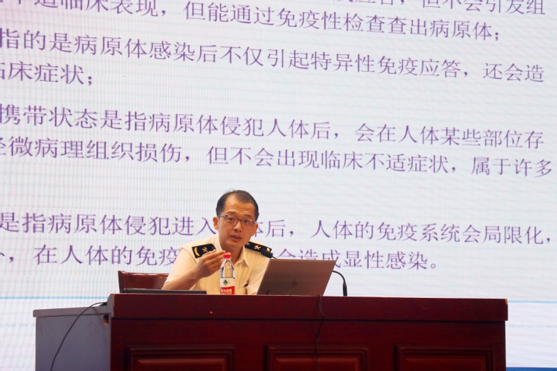 為進(jìn)一步推進(jìn)學(xué)習(xí)貫徹習(xí)近平新時(shí)代中國特色社會主義思想主題教育,深入開展“我為師生辦實(shí)事”活動,6月7日,數(shù)字商務(wù)學(xué)院邀請常州海關(guān)主任醫(yī)師邱文毅于圖文樓報(bào)告廳開展傳染病防控知識講座。講座由數(shù)字商務(wù)學(xué)院黨總支副書記吳佳偉主持,輔導(dǎo)員及全體22級學(xué)生參加。