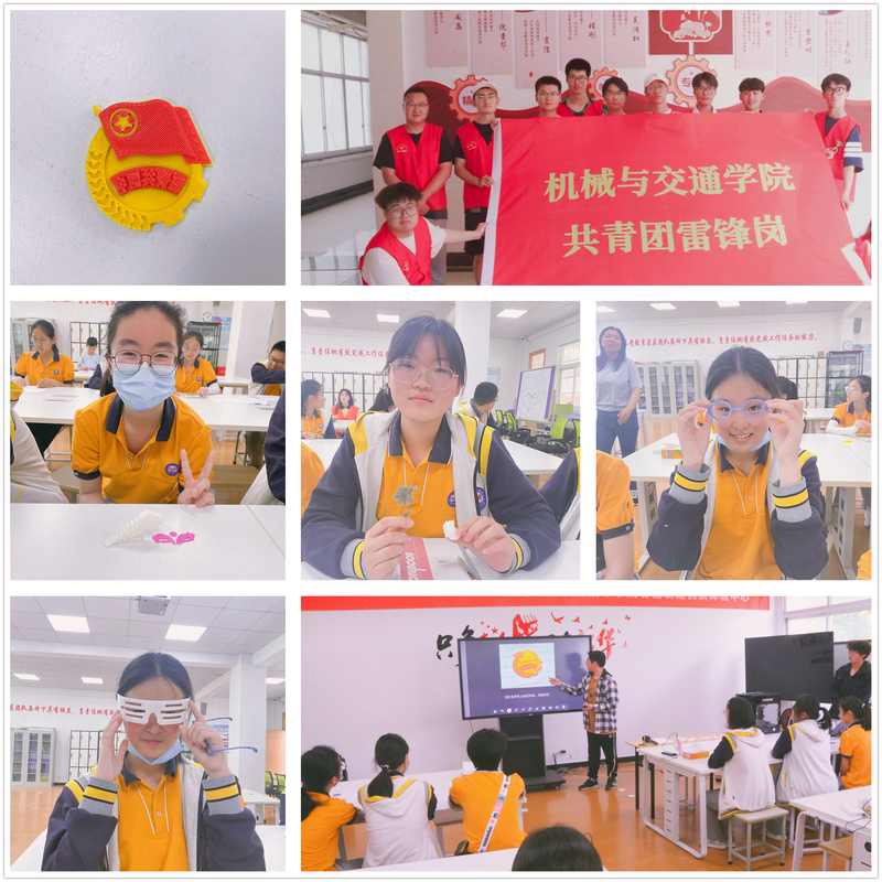 機械與交通學院3D打印協會精心準備活動所需物資,為初中生們開展生動的職業體驗課。技能大賽一等獎獲得者王俊磊為同學們進行專業指導,介紹3D打印知識,展示3D打印技術在當今生活及工業各領域中的應用,示范團徽設計及制作過程。志愿者們帶領每位同學正確操作3D打印筆,動手制作團徽,同學們在本次學習過程中感受科技魅力,并期待將所學知識融入實踐中,以科技‘智’作,表達心中對中國共產主義青年團的向往。在“創意設計”環節,志愿者們指導大家設計出自己喜歡的作品,同學們創意滿滿,別出心裁,制作有創意眼鏡、?;?、五月的花朵、母親節愛心等等作品?;顒咏Y束后,志愿者將自己設計的共青團團徽、科技眼鏡、小動物等贈送給每位同學,也在他們心中種下一顆科技創新、科技強國的種子。