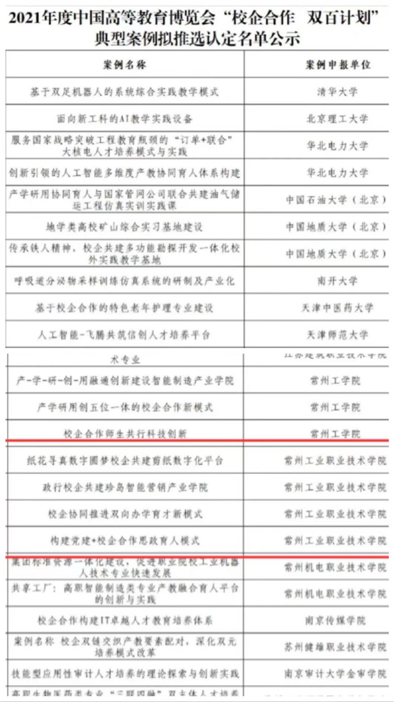 自2019年中國高等教育博覽會首次舉辦“校企合作 雙百計劃”典型案例評選以來,我校先后共有8項案例獲此殊榮,4個項目已在中國高等教育博覽會上進行集中展示、路演,向社會各界展示了學校產教融合、校企合作的最新成果,提升了校企雙方的知名度和影響力。