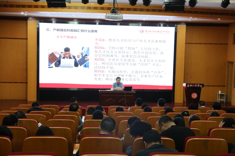姚慶文結合主題教育調研情況,帶領機械與交通學院教師重溫了習近平總書記對科教興國的重要指示,學習了《關于深化現代職業教育體系建設改革的意見》《職業教育產教融合賦能提升行動方案(2023-2025)》等文件精神,闡釋了產教融合、科教融匯的含義及目標任務,分享了相關典型案例,審視了學校在產教融合、科教融匯及科研工作中的現實瓶頸,并給出了解決學校產教融合、科教融匯問題的思路方法、路徑舉措。