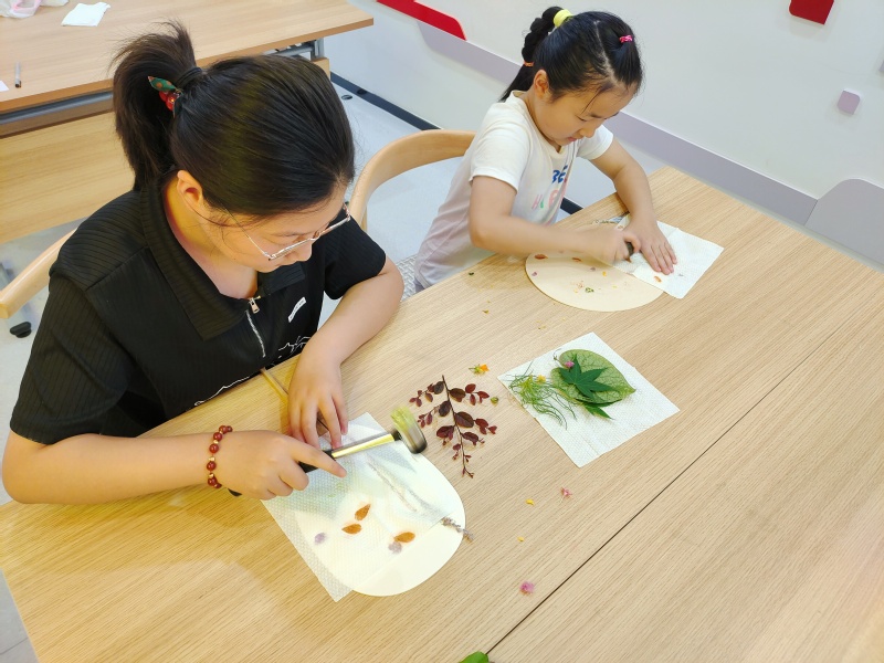 活動現場,孩子們圍坐一起,認真傾聽著老師講解非遺文化以及非遺植物拓染制作步驟。小朋友們興致高漲,積極舉手回答問題。在對拓染有了一定的了解后,他們躍躍欲試,在志愿者的指導下開始了拓染的手工體驗?;顒舆^程中,孩子們認真挑選自己喜歡的染材,仔細設計排列布局,小心翼翼地用方巾覆蓋在染材上,再用橡膠錘、鵝卵石有節奏地敲擊。在一陣陣“咚咚咚”的聲音中,植物的脈絡一點點展現在扇面上。在最后的作品展示環節,小朋友們舉著各具特色的拓染扇面,臉上洋溢著喜悅。