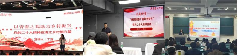 藝術創意學院學生黨支部以主題教育為契機,全面提升黨員黨性修養,把堅定理想信念、對黨忠誠作為終身必修課,全面學習領會習近平新時代中國特色社會主義思想、黨的二十大精神。5月,“一站式”社區藝術創意學院輔導員工作室組織開展黨的二十大精神系列宣講會,學院輔導員們面向不同學生群體,為同學們帶來了一場場精彩的主題宣講。丁潔以“以青春之我助力鄉村振興——黨的二十大精神宣講之鄉村振興篇”為題,帶領同學們重溫了黨的二十大報告中關于鄉村振興的重要論述;肖克以“奮進新時代,青年當有為”為主題,重點圍繞黨的二十大報告提出的“立志做有理想、敢擔當、能吃苦、肯奮斗的新時代好青年”展開宣講,并深刻闡述了其內涵;姚亞琪以“學思悟踐二十大,助學筑夢鑄信念”為主題,針對家庭困難學生,以青年化闡釋的視角從黨的成就、黨的二十大報告中的“關鍵詞”、青年成長與黨和國家發展相結合等幾個方向進行宣講。