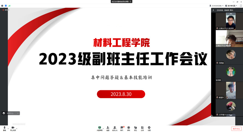 為進一步加強學院副班主任隊伍建設,充分發揮朋輩榜樣的引領作用,提高2023級新生副班主任班級管理水平,切實保障新生入學各項工作有序開展,8月30日下午,材料工程學院召開2023級新生副班主任線上工作會議。學院輔導員周宇、2023級新生輔導員王姝嫻以及全體2023級新生副班主任參加會議。會議由周宇主持。
