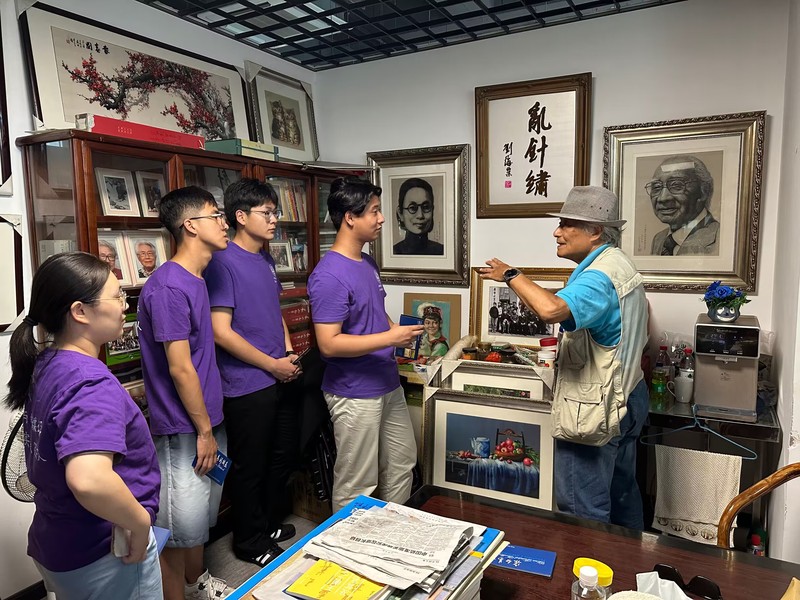 隨后我們走訪了常州亂針繡之宗白易大師工作室。宗老師是非遺亂針繡創始人楊守玉的學生,同時也是中國彩絨畫創始人發明人,從藝55年,曾任新華社、人民日報攝影記者。1972年首創〝中國彩城畫”,經過多年的研究,使其成為一種具有濃郁中國民族特色,融中西藝術為一體的民間工藝品。先后榮獲全國、省、市表彰獎勛,是中國工藝美術協會、上海工業美木設計協會會員、上海幣攝影家協會會員、江蘇省民間文藝家協會會員、中國工商聯合會會員、常州市宗白易彩絨畫研究所所長。1995年被聯合國教科文組織授予〝一級民間工藝美術家”稱號、榮獲國際龍文化金獎。在工作室我們看到了多種主題的刺繡作品,作品主要采用長短交叉線條,分層加色手法來表現畫面。針法活潑、線條流暢、色彩豐富、層次感強、風格獨特。一幅幅精美的作品,讓同學們都嘆為觀止。宗老師教導我們要多學習傳統文化,多感受刺繡作品的魅力,愛上非遺文化并傳承下去。