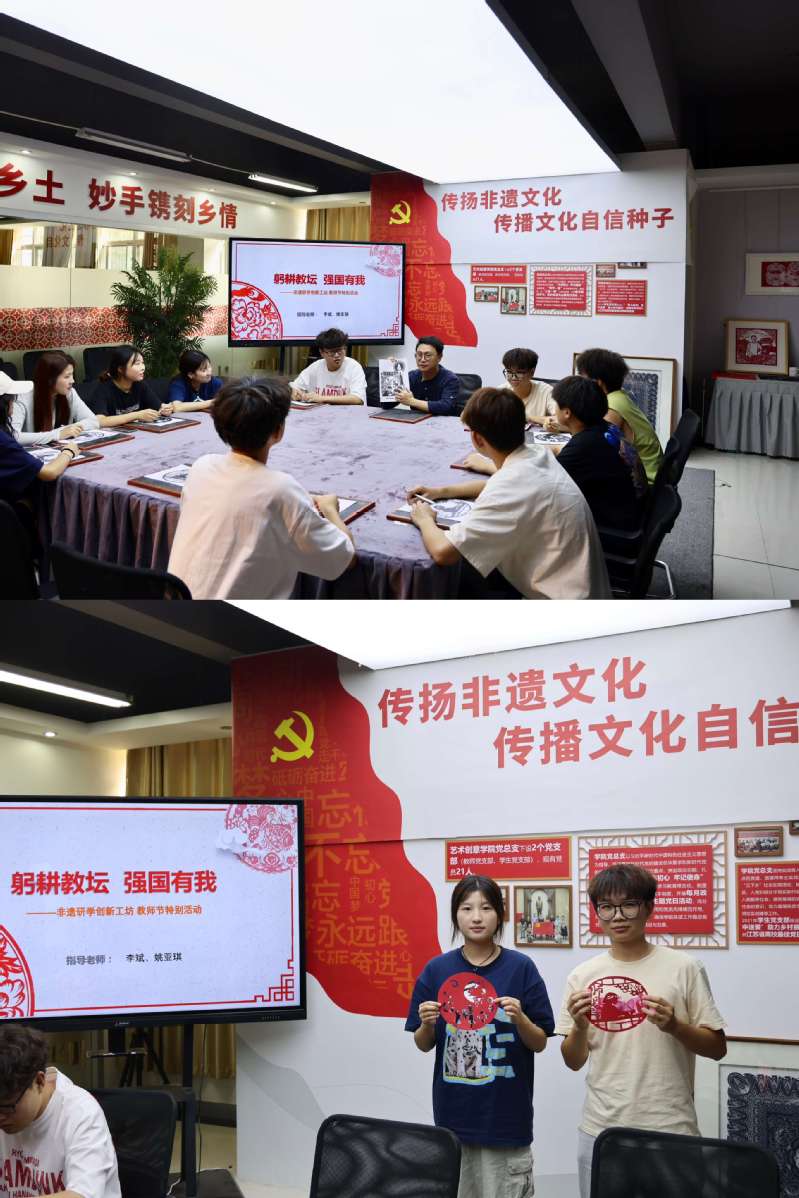 為深入學習貫徹習近平總書記在中央政治局第五次集體學習時的重要講話精神,引導學生懂得感恩,弘揚尊師重教的優良傳統,進一步激勵教師牢固樹立“躬耕教壇,強國有我”的志向與抱負,9月8日,藝術創意學院非遺研學創新工坊開展教師節主題活動,社團指導老師李斌及優秀社員代表參加。