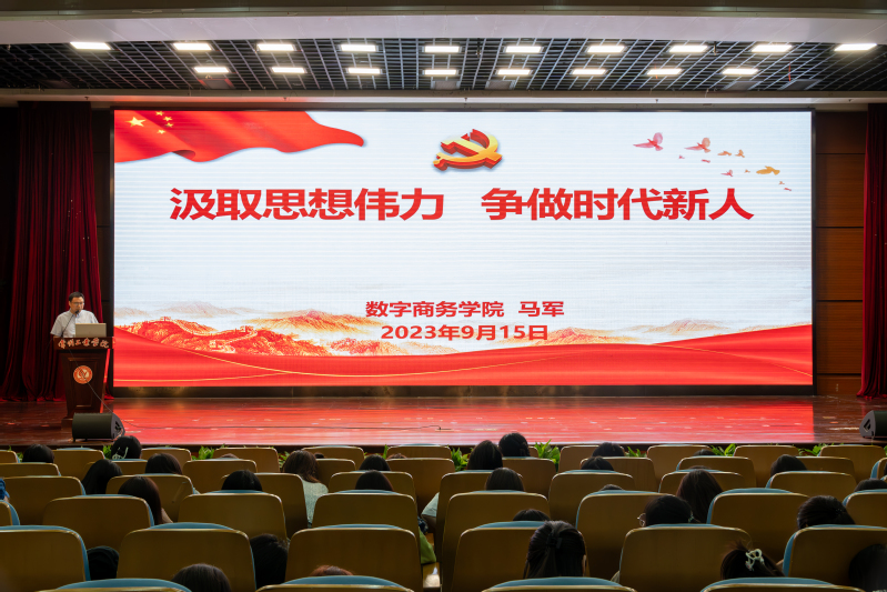 習近平總書記指出:“歷史是最好的教科書,也是最好的清醒劑。”為進一步增強學生政治意識、使命擔當和修養素質,做好新學期學生思想政治教育工作,9月15日,數字商務學院黨總支副書記馬軍以“汲取思想偉力 爭做時代新人”為主題,向全院新生講授“開學第一課”。