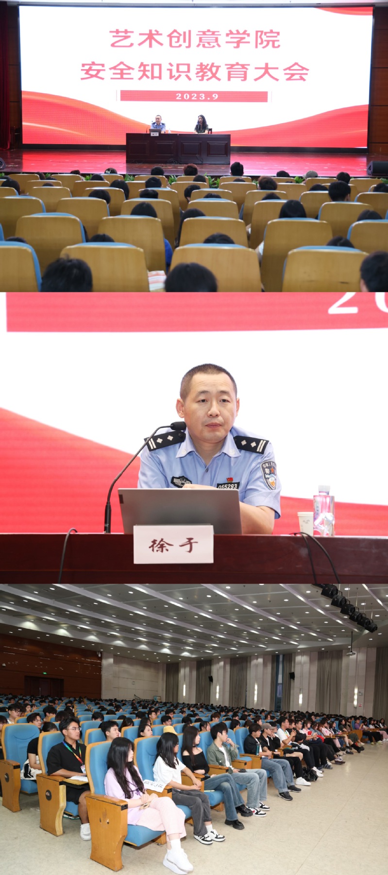 為增強同學們的安全防范意識和法治意識,進一步筑牢校園安全防線,9月14日,藝術創意學院開展開學安全第一課。學校法治輔導員、科教城派出所民警徐于應邀為藝術創意學院全體在校師生作了一場法治安全教育講座。
