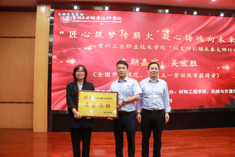 鄧建軍工匠學(xué)院院長袁飛、機械與交通學(xué)院院長徐偉共同為吳宏勝頒發(fā)了學(xué)校“以大師引領(lǐng)未來大師行動”師徒結(jié)對導(dǎo)師,青年教師傳幫帶導(dǎo)師聘書。吳宏勝和材料工程學(xué)院院長滕業(yè)方一起為23高分子531班授予“吳宏勝班”班牌,希望該班的同學(xué)們能夠在實踐中練就過硬本領(lǐng)、培育精益求精的工匠精神。