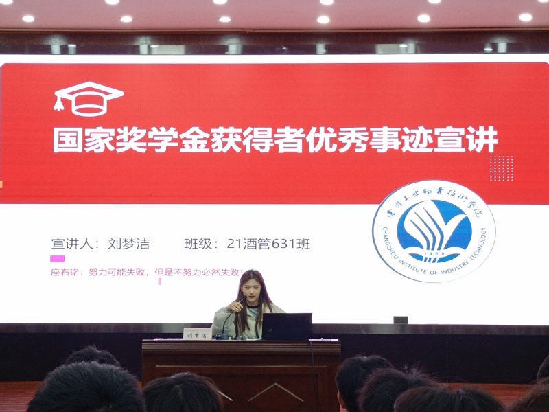 國家獎學金獲得者21酒管631班劉夢潔同學,講述了她獲得江蘇省職業院校技能大賽旅游類餐廳服務賽項高職組一等獎以及全國職業院校技能大賽高職組酒水服務比賽團體二等獎在備賽過程中的勵志故事,鼓勵同學們志存高遠,全面發展,勤奮刻苦學習,熱愛所學專業,促進自己能力的全面提升。