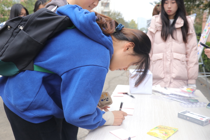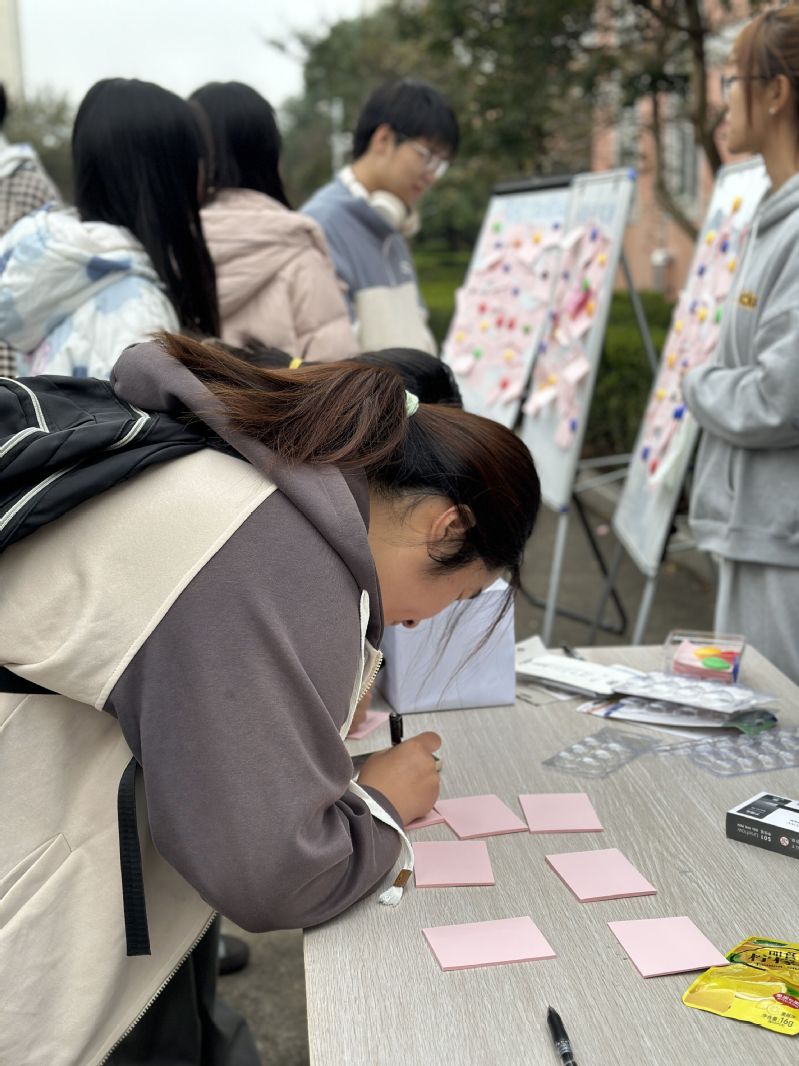 活動內(nèi)容深受同學(xué)們的喜愛,前期報(bào)名人數(shù)達(dá)百人。活動伊始,同學(xué)們前往“情緒交換商店”,有的將自己的煩惱寫在情緒卡片上,投入“情緒垃圾桶”中,和煩惱告別;有的將自己的快樂事件存入“快樂分享站”中,留下快樂共享幸福;有的從“陽光加油站”中隨機(jī)抽取專屬祝福語,收獲一天的好運(yùn)與快樂。活動現(xiàn)場還設(shè)置了小驚喜,每位參與活動的同學(xué)可從“快樂盲盒”中進(jìn)行抽獎,抽取“小數(shù)點(diǎn)”心理輔導(dǎo)站提供的心理健康教育宣傳小禮物,幫助同學(xué)們認(rèn)識到生活中處處充滿驚喜,要笑對生活中的不如意。
