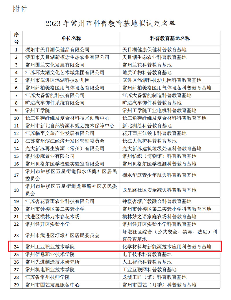 為深入學習宣傳貫徹習近平新時代中國特色社會主義思想和黨的二十大精神,全面落實黨中央、國務院《中華人民共和國科學技術普及法》以及常州市發布的《2023年全市護航新能源之都建設科普宣傳教育工作實施方案》等文件精神,結合常州市和我校實際,近日,常州市科學技術局聯合宣傳部、教育局、科協組織開展申報2023年度常州市科普教育基地,我校材料工程學院材料與新能源應用技術科普基地獲批常州市科普教育基地。