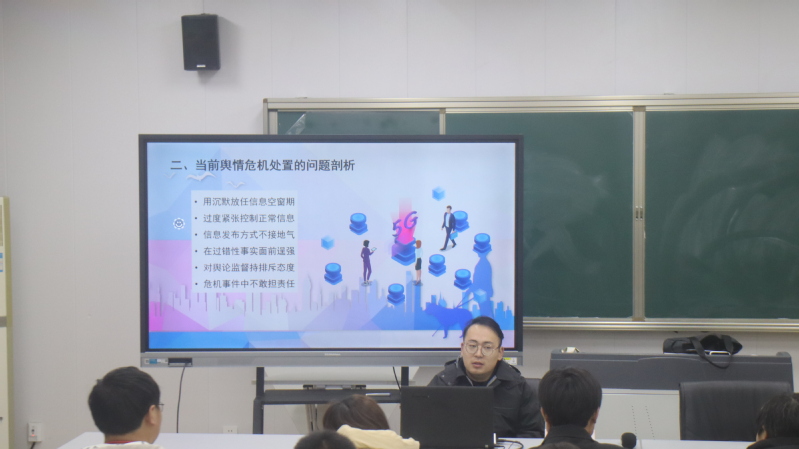 周振老師從新媒體時代的輿情特點入手,分析了信息傳播速度快、輿情發(fā)酵周期短、傳播主體多元化等特點,并針對這些特點提出了相應(yīng)的危機(jī)應(yīng)對策略。他強(qiáng)調(diào),學(xué)生干部作為學(xué)院管理工作的核心力量,要時刻關(guān)注輿情動態(tài),提高危機(jī)應(yīng)對能力,確保學(xué)院管理工作的正常開展。