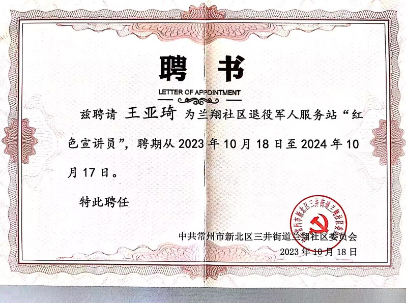 蘭翔社區抗美援越老戰士陸恩和,是數字商務學院關工委特聘教師。他身為社區老兵志愿服務隊的一員,當天身穿綠色戎裝、佩戴榮譽獎章,帶領師生們實地參觀了蘭翔社區退役軍人服務站文化展廳,飽含深情地向師生們分享了從軍經歷,細細講述了援越抗美出國作戰的歷史背景,艱苦卓絕的戰斗生活條件以及“熱血軍魂 永葆本色”的老兵故事。此外,陸老還在社區內開設了革命故事道德講堂,宣傳紅色文化,以實際行動深耕老兵精神。他積極邀請4名大學生退役士兵擔任服務站“紅色講解員”,為他們頒發了聘書,希望青年人能夠充分發揮退役軍人帶頭模范作用,運用老兵特長,將紅色基因融入個人成長發展,在勤學苦練中增加知識、增強本領,積極投身到祖國建設實踐中。