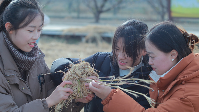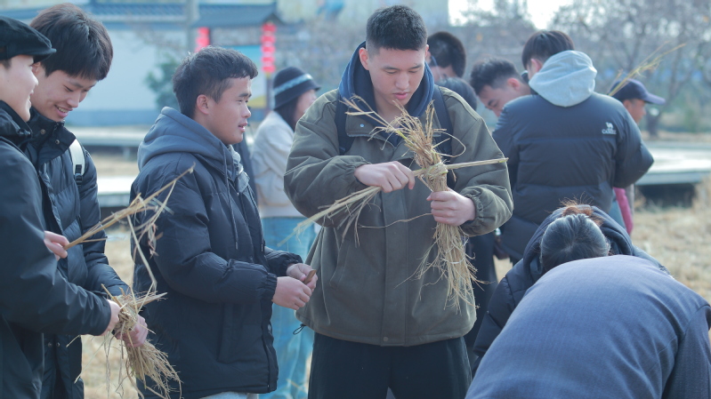 在活動中,全體人員來到了太湖灣耕讀大學堂,觀看視頻學習割水稻、做飯、搓草繩等操作要點和注意事項。教官把在場人員分成兩組,一組開展編草墊、搓草繩、做稻草人等實踐,在田野里跟著老爺爺一起學習編織技巧,大家學得認真、做得仔細,離開時甚至帶著自己的“作品”回家;另一組負責領食材、洗切菜、點燃灶膛、熱油、炒制,小組分工合作一步步完成,在困難面前勇敢嘗試并相互鼓勵。參與培訓的學生干部在實踐中認識到勞動對于農業生產的重要性,通過勞動實踐提高了自己的身體素質,增強了團隊協作能力和社會責任感。