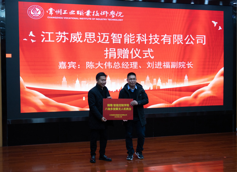 陳大偉代表江蘇威思邁智能科技有限公司向智能控制學(xué)院捐贈(zèng)兩臺(tái)八軸多旋翼無(wú)人機(jī)。劉進(jìn)福表達(dá)了對(duì)企業(yè)的歡迎和感謝,雙方合影留念。千里同好,堅(jiān)于金石,企業(yè)是學(xué)院高質(zhì)量發(fā)展的重要資源。江蘇威思邁智能科技有限公司自2020年與智能控制學(xué)院開(kāi)展校企合作項(xiàng)目以來(lái),在無(wú)人機(jī)執(zhí)照培訓(xùn)和課程建設(shè)上取得了一系列成果。此次捐贈(zèng)將為學(xué)院發(fā)展注入新動(dòng)能,學(xué)院也將以此為契機(jī),教育激勵(lì)廣大學(xué)子,將這份愛(ài)心轉(zhuǎn)化為努力成長(zhǎng)成才的不竭動(dòng)力。