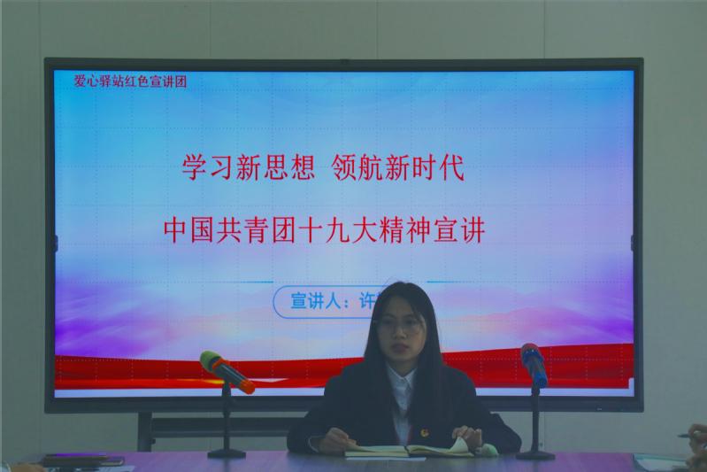 宣講團團長許婉儀帶領大家全面學習黨中央致詞的主要精神、團十九大報告的主要內容等,圍繞對團十九大精神的理解進行了分享。她向學生宣講到,團十九大是在以習近平同志為核心的黨中央帶領全黨全國各族人民邁上全面建設社會主義現代化國家新征程、向第二個百年奮斗目標進軍的關鍵時刻召開的一次青春盛會,對做好新時代共青團工作和青年工作提出了明確要求,提供了重要遵循,要深刻認識團十九大的重要歷史意義,堅決貫徹大會做出的重大決策部署,堅定理想信念,勇擔時代重任,發揚斗爭精神,保持奮斗激情,努力成為擔當民族復興重任的時代新人。她希望同學們努力學習、積極向上,做有理想、敢擔當、能吃苦、肯奮斗的時代好青年,用汗水揮灑青春,用拼搏詮釋夢想,以青春之你我,赴萬丈理想,續時代華章,用實際行動踐行“請黨放心,強國有我”的青春誓言。