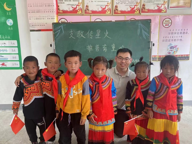 6月26日,常州工業職業技術學院旅游與康養學院組織師生前往大涼山,以當地幼教點為主陣地,開展普通話推廣活動。身在北京掛職的王風圳毫不猶豫地加入了實踐團隊。在大涼山支教的五天里,王風圳深刻感受到孩子們對知識的渴望。課堂上的他,利用“工、共、貢”的普通話讀音,闡述了這些字眼背后的深刻涵義,并將普通話教學和愛黨愛國的家國情懷緊密結合,因勢利導,循循善誘。課堂氣氛熱烈,孩子們都很喜歡面前的這位“王老師”。