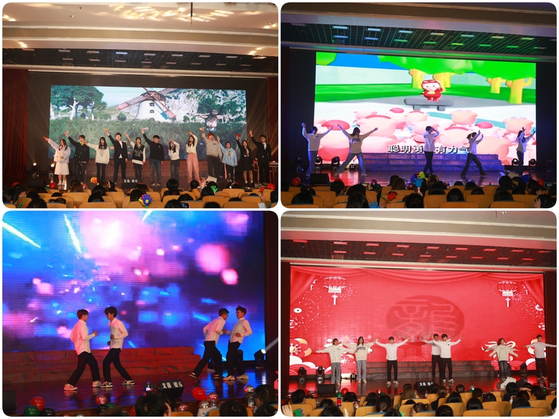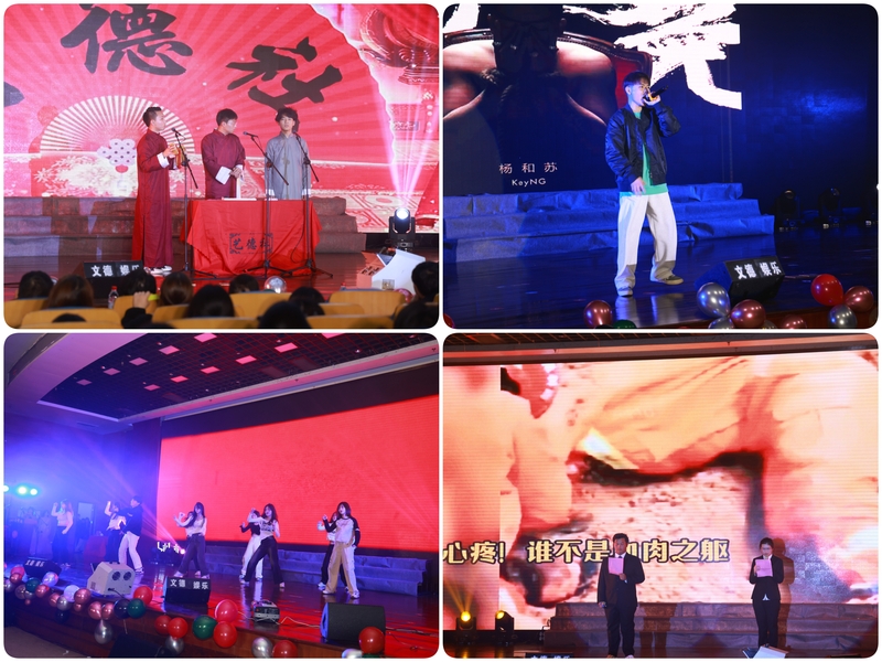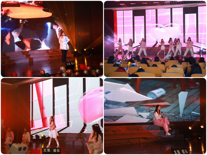 演出環節以藝術團周睿樂隊的《山海》作為開篇。首發節目是藝術團民舞團的《拉丁民舞串燒》,熱烈的舞姿,悅動的旋律,交織在光影之間,展現著傳統與時尚的碰撞;武術民樂表演《象王行》以其細膩的描繪、雄奇的氣勢、優美的樂感為大家帶來一場視覺盛宴;歌曲《后來》表演者白偉杰同學帶領大家一起齊唱,將現場氣氛熱烈地帶動了起來;朱益桐老師的精彩配音《聲臨其境》充分展示了青年教師的時尚、活力與朝氣;相聲《我請學弟學妹聽京劇》,生動幽默、活潑有趣的話語為大家帶來了歡樂的氣氛;說唱《吹又生》展現了大學生朝氣蓬勃昂揚向上的精神風貌;街舞團《Talk Dirty》展示了大學生的青春風采和魅力才華,再次點燃了現場火熱的氣氛;朗誦加歌曲《人間有愛》以富有創意的表達形式,向在甘肅抗震救災的消防子弟兵致以崇高的敬意,彰顯舉國同心、命運與共的家國力量;歌曲情景劇《我的紙飛機》以別出心裁的演繹方式,引人入勝的表演,將觀眾代入故事情節,引起大家的共鳴。舞蹈《舞蹈為名的烤串店》以當下網絡熱門舞蹈為素材進行表演,贏得現場觀眾掌聲陣陣,歡呼尖叫聲此起彼伏。影子戲《青春匆匆流》以獨特的方式勾勒出了同學們最美好、最青春大學時光中的點點滴滴;最后,由藝術創意學院學生會全體成員共同演唱的《相親相愛》也將整場晚會的氛圍再次推向了高潮,展現了藝術創意學院學子團結友愛、互幫互助的精神風貌。