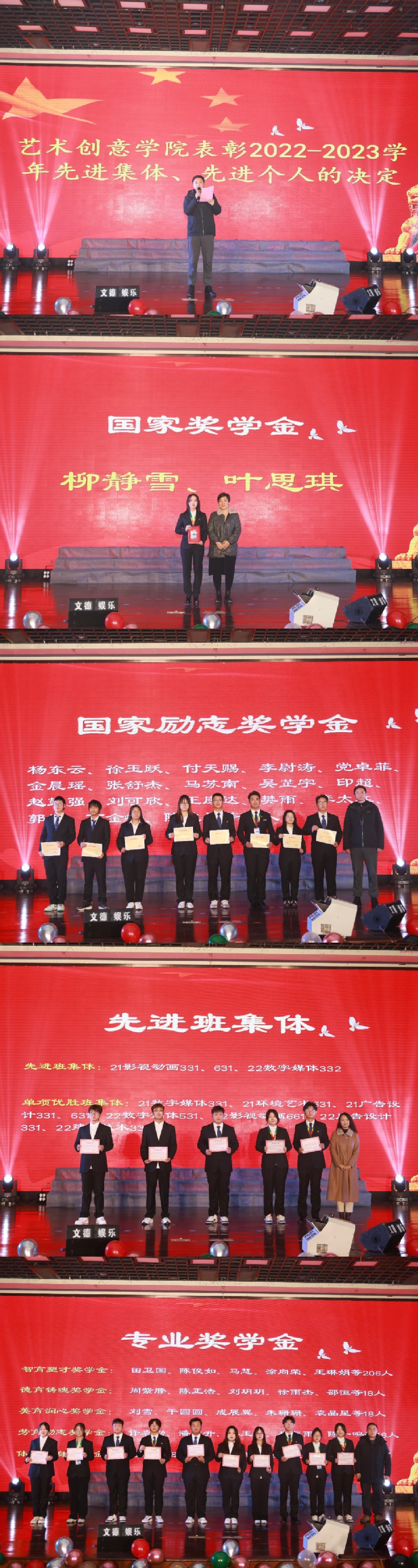 本次表彰大會對2023年度獲得國家獎學金、國家勵志獎學金、先進班集體、三好學生、五好青年、優(yōu)秀學生干部、德育、智育、體育、美育、勞育獎學金的優(yōu)秀學生和先進集體進行了表彰。學院領(lǐng)導(dǎo)分別為獲獎學生代表頒獎。國家獎學金獲獎學生代表柳靜雪表示,將繼續(xù)胸懷理想、志存高遠,在未來的學習生活中迎難而上,突破自我,厚積薄發(fā)。