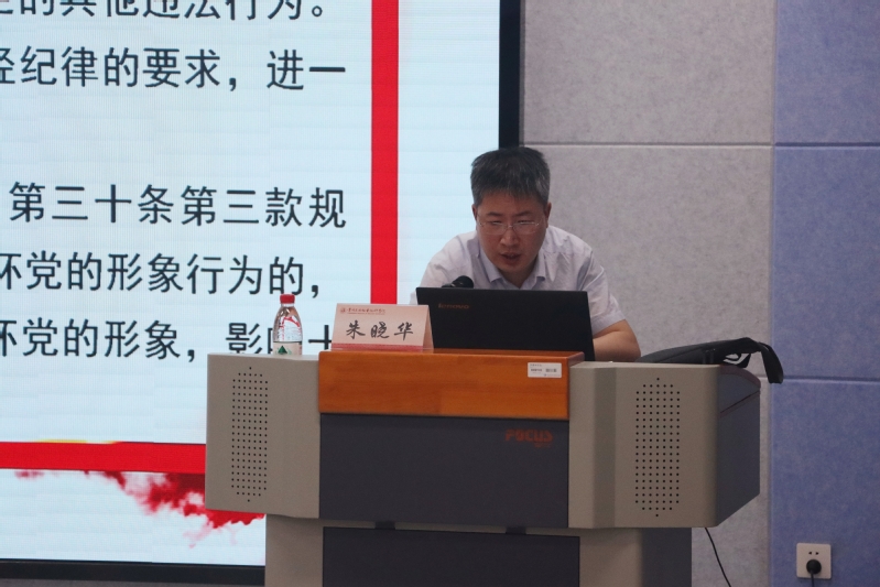 6月26日,校黨委委員、紀委書記朱曉華為材料工程學院講授黨紀學習教育專題黨課。材料工程學院黨總支書記嵇天培主持,學院全體黨員教師和學生黨員代表參加。