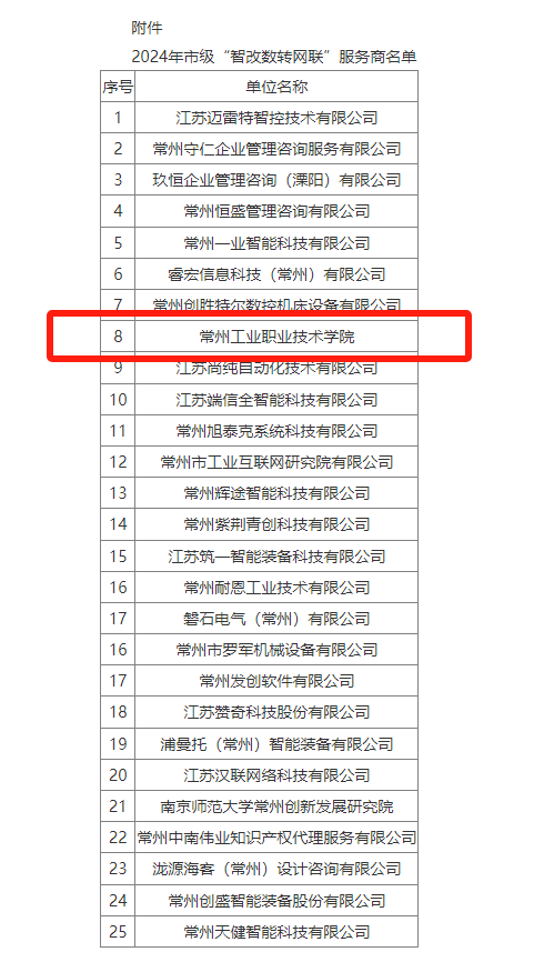 7月21日,從產學研合作處傳來喜訊,在近日常州市工信局公布的2024年市級“智改數轉網聯”服務商名單中,我校榜上有名,是25家服務商中唯一高校。此次入選不僅標志著我校在推動智能化改造、數字化轉型及網絡互聯等方面邁出了堅實的一步,也為我校繼續深化教育數字化發展指明了新的方向。