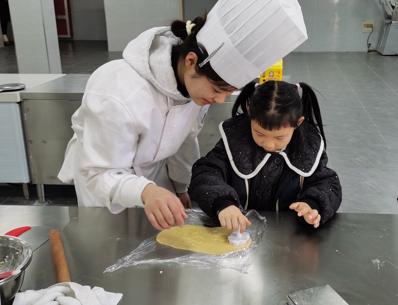 本次活動在食育科普、食材簡介中正式開始。在葛小琴老師指導下,烹飪工藝與營養、嬰幼兒托育服務與管理專業學生分組帶領幼兒體驗餅干的制作。從揉捏搟卷到捏制造型,幼兒們卷起衣袖,大展身手,與大哥哥、大姐姐一起制作造型精美的餅干??粗约河H手制作的美食,幼兒都感到非常有成就感,在實踐中體驗到了勞動的樂趣和價值。在蒸烤等待的過程中,嬰幼兒托育服務與管理專業學生還組織幼兒開展了動感活力的趣味游戲,小朋友們積極參與,體驗運動帶來的快樂。