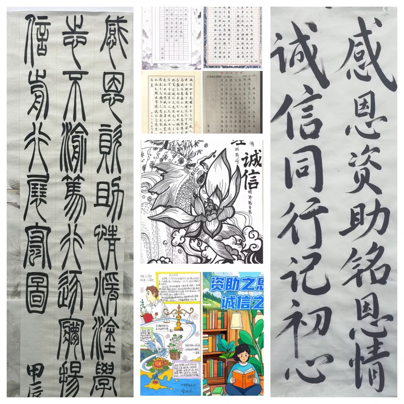 活動自寒假啟動以來,學生們積極參與,精心創作。他們圍繞誠信感恩主題,運用各自擅長的書法風格和創意元素,設計出一幅幅既美觀又富有教育意義的書法海報。學生們在作品中融入了對誠信的理解與感悟,用真摯的情感表達了對國家資助政策的感恩之情。一幅幅精美的作品,不僅展現了學生們扎實的書法功底和獨特的藝術創造力,更體現了他們對誠信價值觀的深刻領悟。