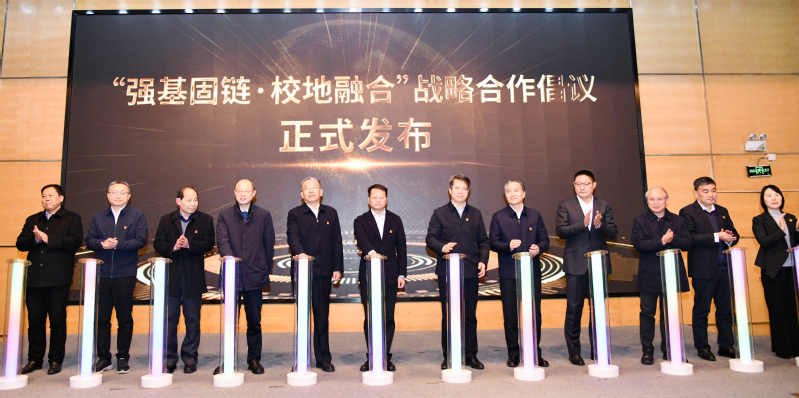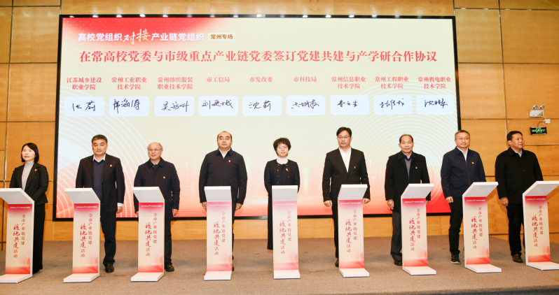 席海濤與常州市委教育工委書記司馬雙龍、其他在常高校黨委書記共同發布“強基固鏈·校地融合”戰略合作倡議,并與常州市發改委、工信局、科技局等市級產業鏈牽頭部門負責人簽訂合作協議。