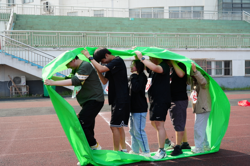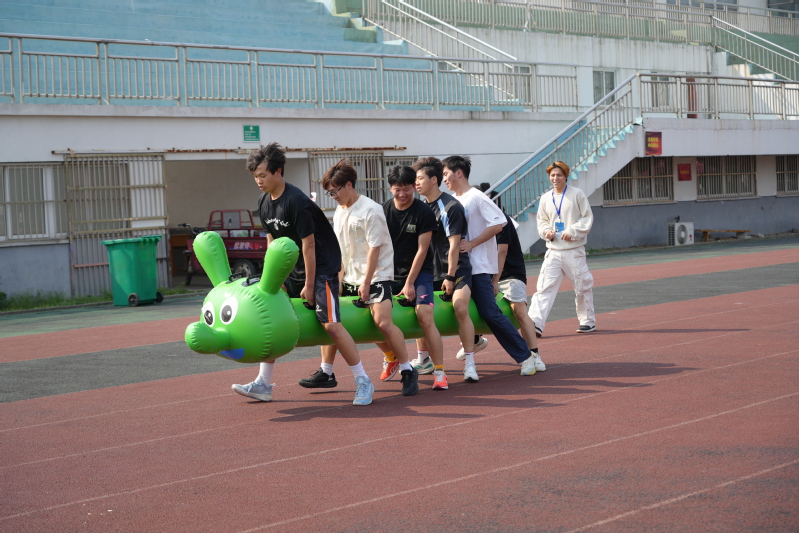 在“三人四足”中,隊員們綁腿并肩,喊著整齊的口號沖向終點;“螃蟹賽跑”則讓選手們化身“橫行小分隊”,滑稽的步伐引發陣陣笑聲;“板磚過河”項目,同學們手腳并用傳遞過河板磚,稍有不慎便“落水”重來,緊張又歡樂。最熱鬧的當屬“跳大繩”,長繩翻飛間,隊員們默契起跳,圍觀同學的計數聲一浪高過一浪。“背對背夾球跑”和“無敵風火輪”將合作精神推向高潮。背靠背的選手們小心翼翼護住氣球,時而因速度過快而“人球分離”,引得全場捧腹;而“風火輪”項目中,各班隊員站在巨型布圈內統一步伐,宛如一條彩色長龍滾滾向前。“毛毛蟲競速”壓軸登場,六名隊員騎在充氣毛毛蟲上蹦跳前進,憨態可掬的模樣讓賽場秒變“大型表情包現場”。