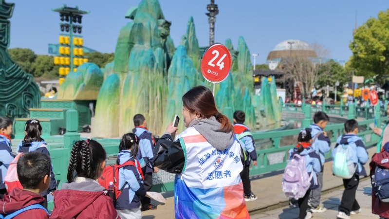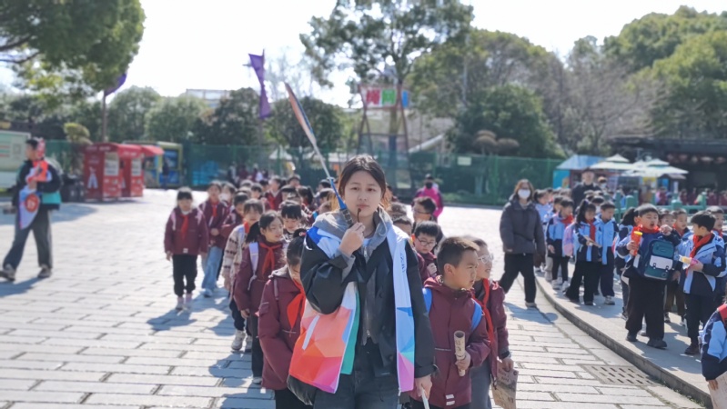 在春秋淹城樂園和中華恐龍園,志愿者們和孩子們一起欣賞吳越文化風貌,結合出土文物為孩子們講解古代城池布局與社會制度;通過科普講解與互動體驗相結合,志愿者們和孩子們學習地質演變與生物進化知識,感悟科學與人文的共生關系。志愿者23旅游631班王靜茹表示:“通過古今對比,我們不僅了解了常州的歷史底蘊,更激發了探索未來的科學精神。”