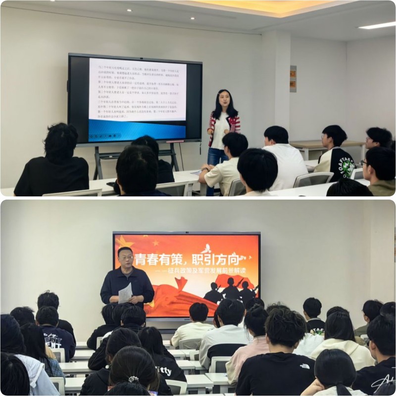 學(xué)工處人武部袁偉民老師以“征兵政策解讀及答疑”為主題,聚焦國(guó)防事業(yè)與個(gè)人發(fā)展的融合。他針對(duì)征兵體格條件、政審流程、入伍優(yōu)待等熱點(diǎn)問(wèn)題逐一解析,并對(duì)比直招軍士、義務(wù)兵等不同路徑的選拔要求與發(fā)展空間。活動(dòng)中,退役軍人校友分享軍營(yíng)歷練對(duì)職業(yè)素養(yǎng)的錘煉作用,展現(xiàn)“軍營(yíng)大學(xué)校”對(duì)意志力、執(zhí)行力與團(tuán)隊(duì)協(xié)作能力的全面提升作用,為有志投身強(qiáng)軍事業(yè)的學(xué)生提供從“入伍選擇”到“退役保障”的全周期指導(dǎo),點(diǎn)燃學(xué)子報(bào)國(guó)熱情。