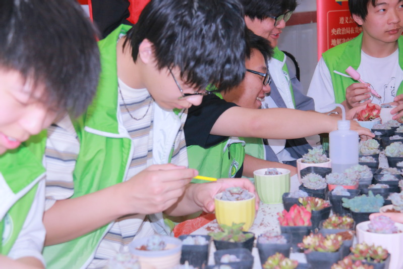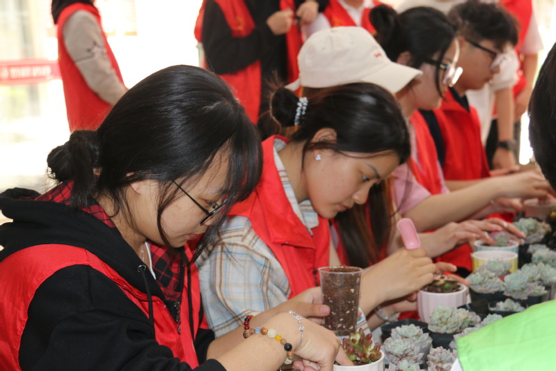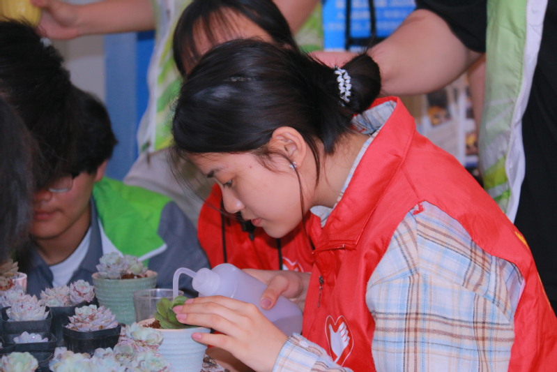 綠之源社團成員在活動現場布置了多肉植物種植體驗區。參與者領取花盆、營養土及多肉幼苗后,在志愿者指導下學習配土、移栽、裝飾等技巧。“葉片排列要疏松透氣,澆水要遵循‘寧干勿澇’原則……”社團負責人姚錫祥邊示范邊科普多肉養護知識。