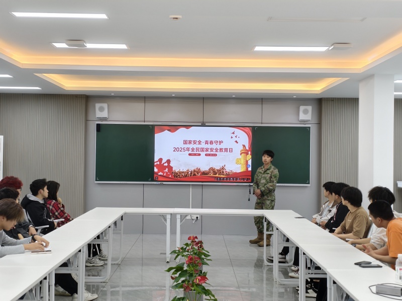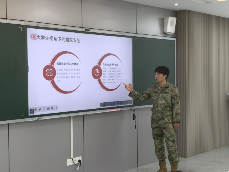退伍學生周南身著戎裝英姿颯爽,以自身在部隊的經歷為切入點,分享了一段段扣人心弦的故事。在邊境執行戍邊任務時,面對惡劣自然環境與復雜地緣形勢,他和戰友們始終堅守崗位,用行動詮釋著對國家領土完整的誓死捍衛。在參與搶險救災等非戰爭軍事行動中,爭分奪秒挽救生命財產的經歷,讓他深刻領悟到國家安全與人民福祉的緊密聯系。這些生動案例使在場師生真切感受到國家安全并非抽象概念,而是體現在每一位守護者的日常堅守與關鍵時刻的挺身而出中。