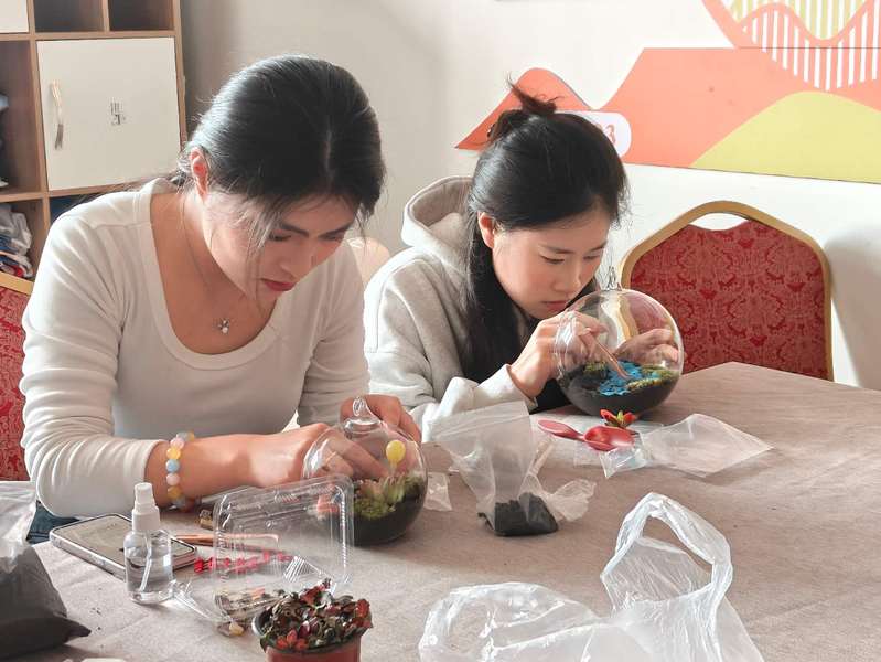 在綠植DIY活動現場,學院精心準備了多肉植物、苔蘚微景觀、環?;ㄅ璧炔牧?,參與者可以自由選擇植物品種,并積極發揮主觀能動性進行創意設計?,F場既有學生將玻璃瓶改造成“微縮森林”,也有同學用顏料在素色花盆上繪制地球、綠葉等環保圖案,賦予綠植容器獨特的意義。