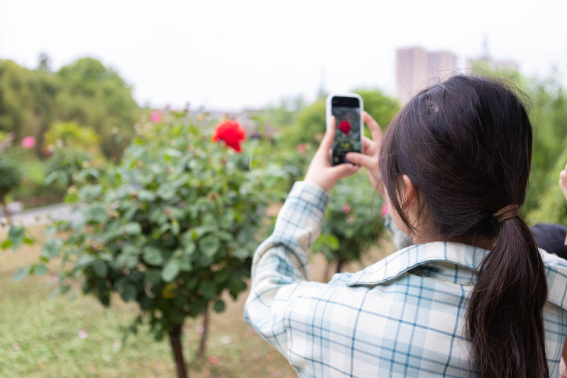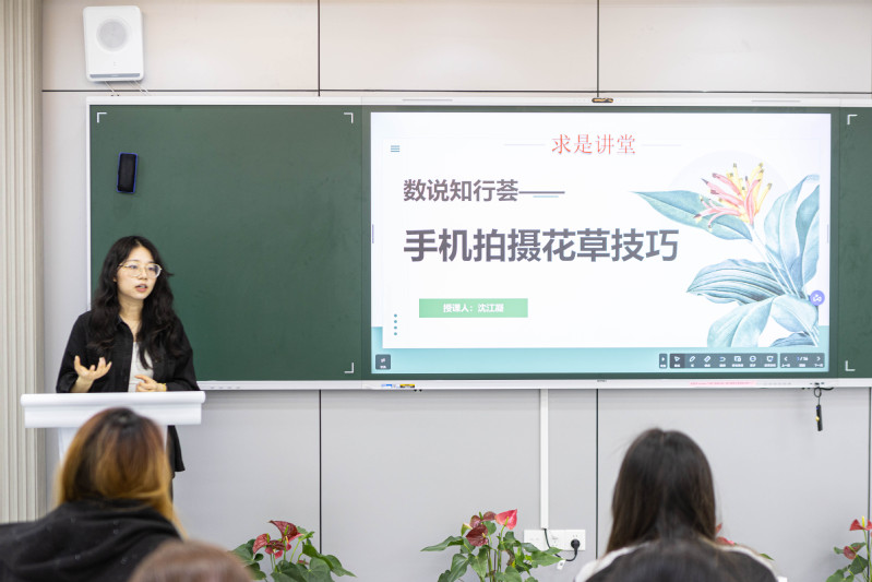 活動中,沈江凝老師以“從細節中發現自然美學”為主題,結合圖文演示,系統講解了手機拍攝花草樹木的七大技巧。她指出,在拍攝樹木時可聚焦局部枝干或葉片,通過幾何構圖與色塊組合呈現抽象美感;在正午仰拍逆光樹葉,能捕捉光線穿透縫隙形成的星芒效果,展現葉片通透質感;而剪影拍攝則需選擇形態優美的枝干,以純凈天空為背景來突出線條韻律。針對花卉攝影,她建議貼近主體虛化背景、精準對焦花瓣或花蕊細節,并借助微距鏡頭捕捉露珠晶瑩與花蕊紋理。此外,她提出的抓拍昆蟲動態時利用連拍模式、使用單色布料簡化背景等技巧,也讓現場學生收獲頗豐。