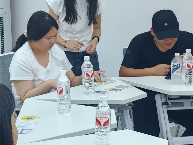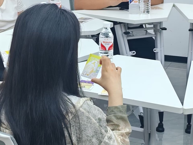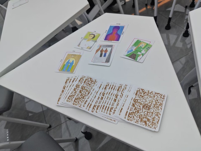 活動現(xiàn)場,同學們圍坐在一起,沉浸在卡牌的世界中。活動伊始,賓玉芳通過OH卡基礎知識講解與趣味互動問答,引導同學們理解潛意識投射原理。隨后,在圖像聯(lián)想環(huán)節(jié),同學們從一張張卡牌中汲取靈感,展開豐富的想象力。有人從沙漠綠洲的卡牌中聯(lián)想到學業(yè)路上的堅持與希望,仿佛在無垠的沙漠中看到了綠洲的光芒;有人則借奔跑的小人卡牌訴說著自己的成長心聲,分享著一路走來的喜怒哀樂。