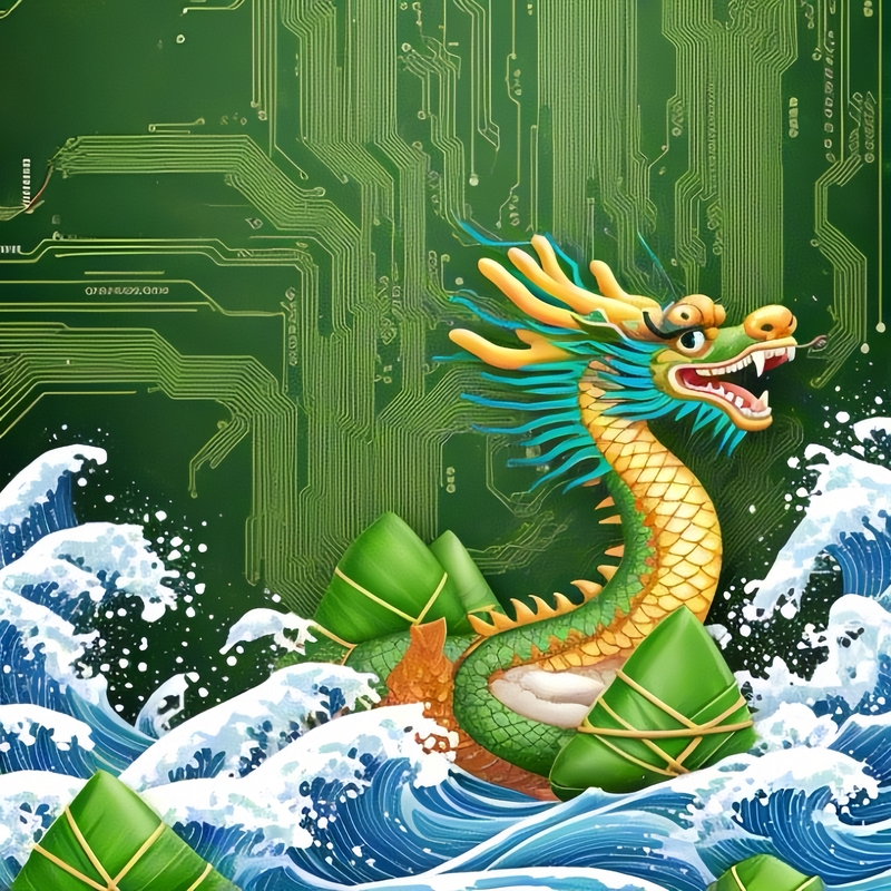 AI賦能文化傳播。智能網聯專業(yè)的同學嘗試用LoRA模型訓練出具有楚辭意境的畫風:輸入“紉秋蘭以為佩”,AI便生成佩戴數據流項鏈的屈原數字形象。最受歡迎的當屬“粽子生成器”,通過調整潛空間參數,竟創(chuàng)造出包含芯片餡料的“科技粽”,其粽葉紋理竟是由0-1代碼構成的楚國云紋。生成式AI創(chuàng)作的海報巧妙融合傳統(tǒng)元素與現代科技:威嚴的龍頭采用非遺雕刻數字化建模,船身則轉化為布滿元器件的綠色PCB電路板,每處焊點都對應《楚辭》中的星宿方位;浪花以動態(tài)的藍色電路走線呈現,模擬數據流傳輸效果,暗喻文化傳承的“信號永不中斷”。