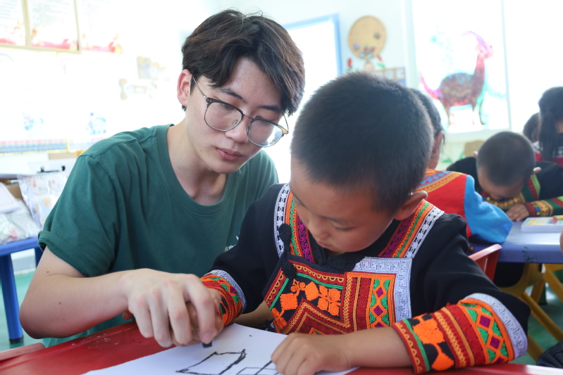 熟悉的村寨和群山再次迎來志愿者的身影,孩子們的臉上洋溢著喜悅。在幼教點的院子里,一系列精心設計的活動有序展開。志愿者杜坤組織孩子們圍坐在一起,生動講述國旗知識。孩子們好奇地觸摸著五星紅旗,認真聆聽關于祖國的故事,清澈的眼神中流露出對“祖國”的初步認知和向往。在志愿者呂彤彤、王晴的帶領下,孩子們拿起畫筆和剪刀,在紙上描繪心中的夢想。創作過程中,孩子們將五彩斑斕的圖案與彝族特色紋樣巧妙結合,民族文化在互動中悄然傳遞。志愿者呂思婉教唱歌曲《我和我的祖國》,孩子們用清亮的童聲認真學唱,稚嫩而飽含深情的歌聲在幼教點回蕩,傳遞著純真的愛國情感。