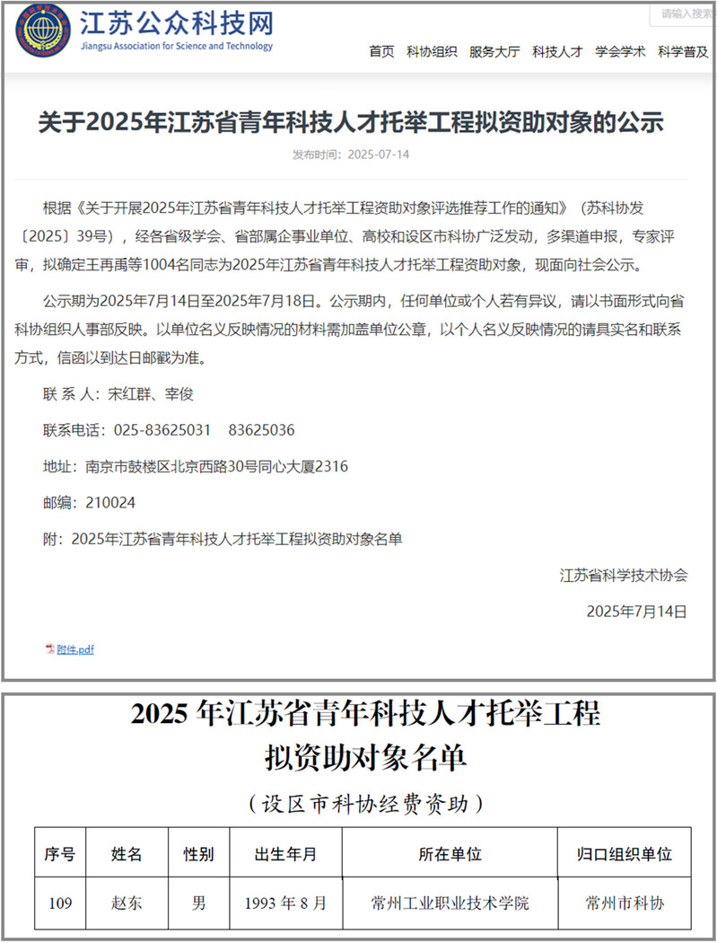 近日,江蘇省科學(xué)技術(shù)協(xié)會(huì)正式公布《關(guān)于公布2025年江蘇省青年科技人才托舉工程資助對(duì)象名單的通知》,我校材料工程學(xué)院趙東博士成功入選該人才項(xiàng)目資助對(duì)象。此次入選,標(biāo)志著我校在高層次人才引培、高水平團(tuán)隊(duì)建設(shè)方面取得了又一次突破。